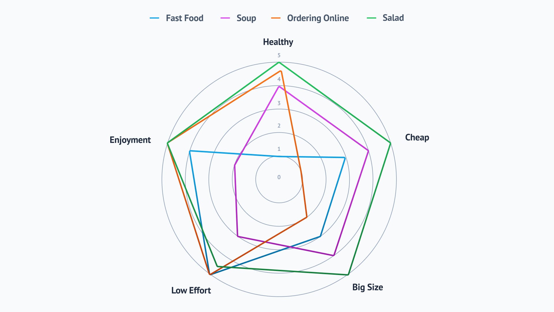 Every meal ticks some boxes, but usually you cannot tick them all. For example, fast food is high enjoyment and little effort, but ultimately unhealthy. Soup is relatively healthy, but often lower in enjoyment. Ordering something tasty and healthy is frequently expensive and not enough.1